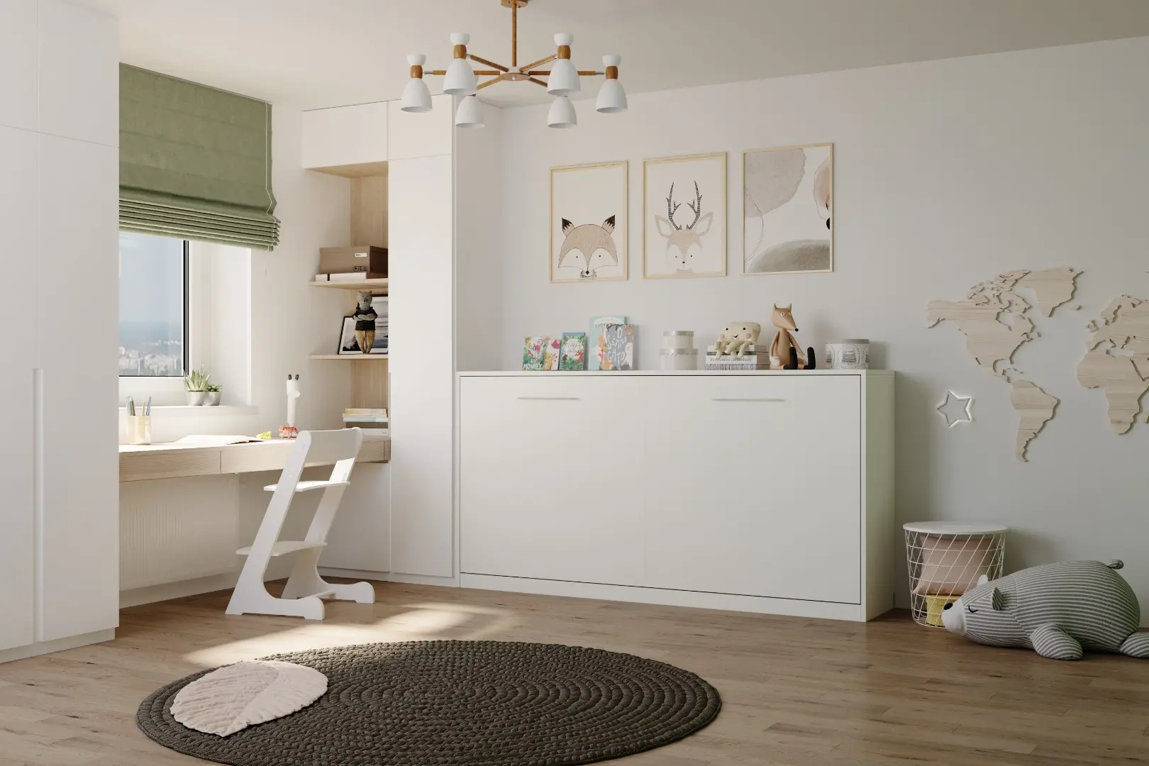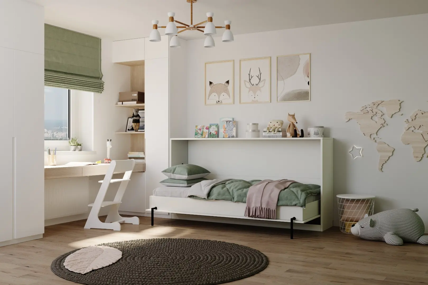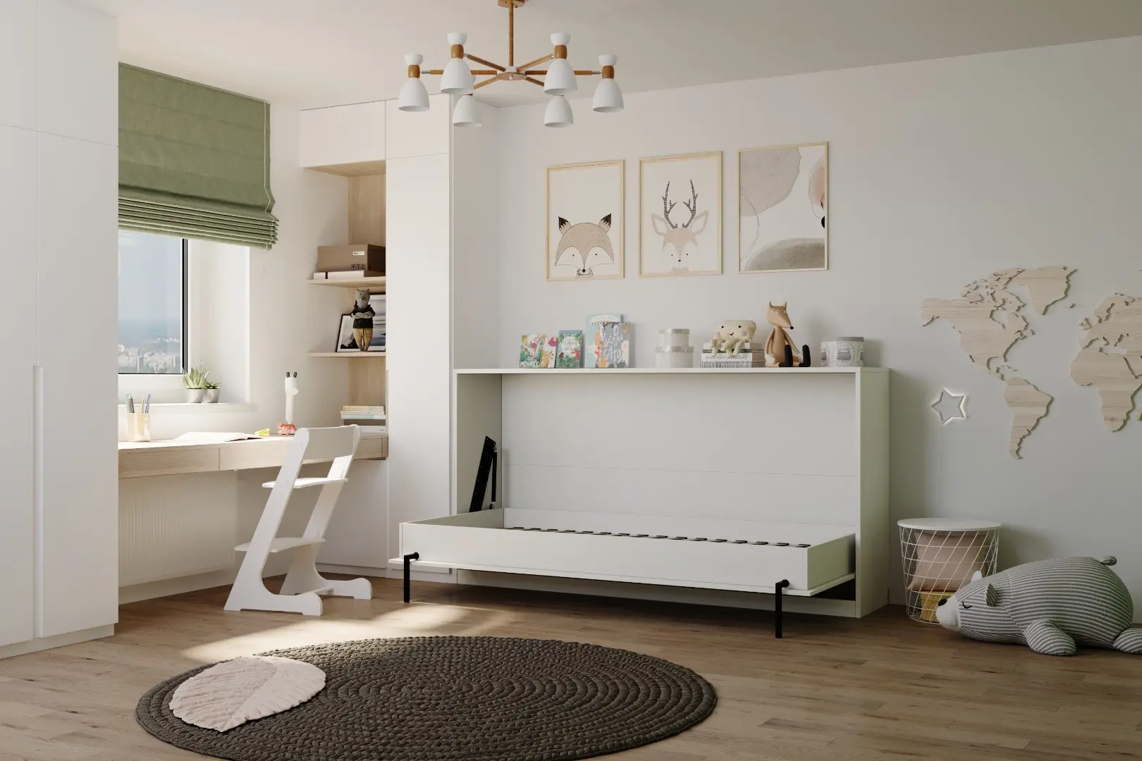 Детская горизонтальная шкаф-кровать "Little sleeper".  Работает на механизме раскладывания собственной разработки "Start". Кровать раскладывается легким движением руки, превращаясь в полноценное спальное место. Просто потяните ее за ручки, расположенные на фасаде и выставите ножки-опоры.